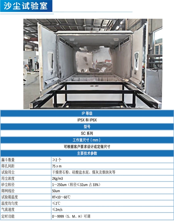 砂(沙)塵試驗(yàn)室是用于考核和確定電工、電子產(chǎn)品外殼和密封性和電氣設(shè)備外殼的(IP)防護(hù)等級(jí)鑒定,以及在砂塵試驗(yàn)后或在試驗(yàn)期間能否保證設(shè)備和元件良好的工作性能,和現(xiàn)在使用的(道路車輛 外部照明和光信號(hào)裝置環(huán)境耐久性)的試驗(yàn)。